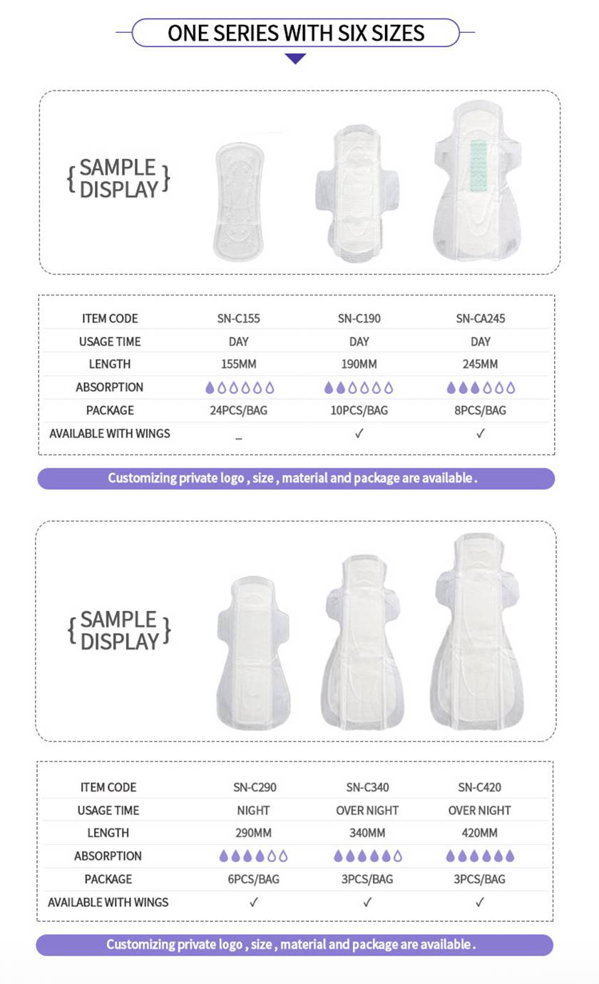 A5: We have 5 normal sizes about the disposable sanitary napkins . 150mm sanitary pads with no SAP , 180mm mini pads with no wingless , 245mm sanitary napkins for daily use , 290mm night use sanitary pads , overnight female pads with 340mm and 425mm extra long sanitary towel for heavy menstrual blood .